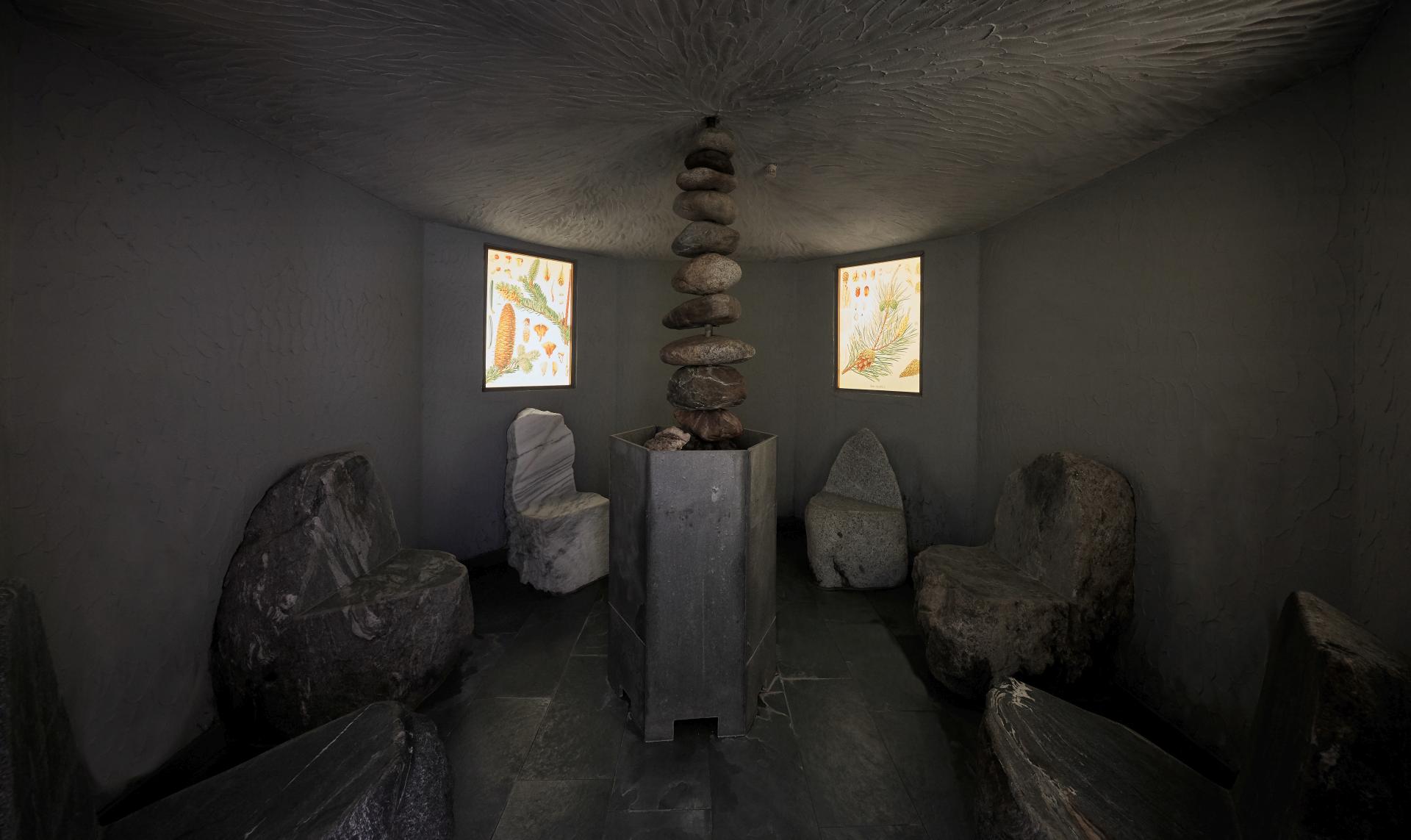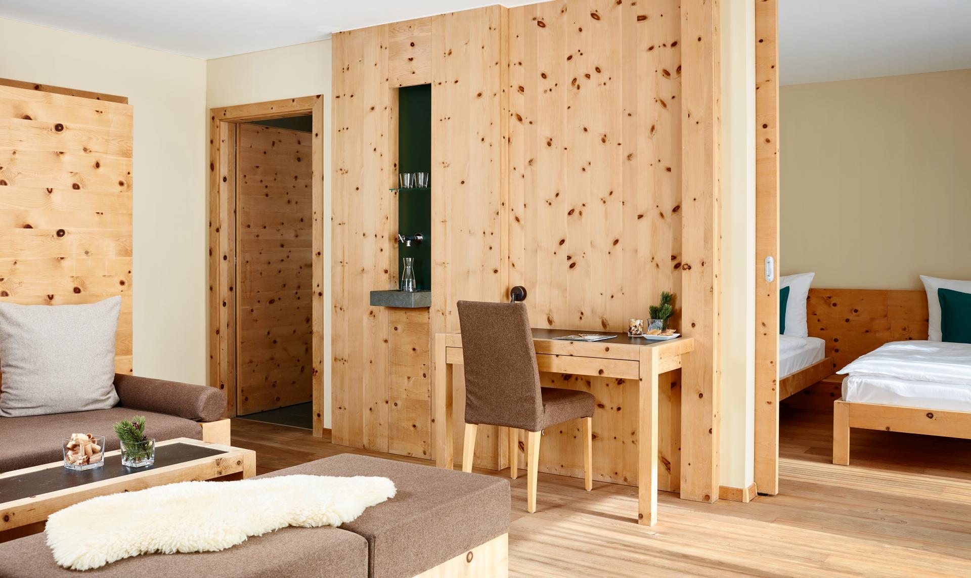 Natur pur: Zirbenholz, Schiefergestein und Schafwolle