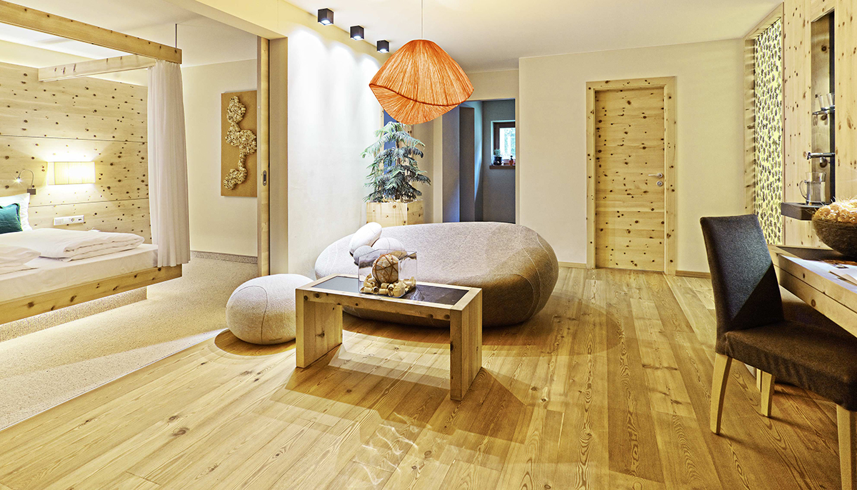 In diesem Boutique Hotel bei Meran dreht sich alles um die Natur: Zirbelholz, Schafwolle und Schiefergestein sind die drei Elemente, auf denen unser Naturhotel in Südtirol baut. Natürliche Cremes, Öle und Düfte werden zur Körperpflege und für Kosmetikbehandlungen verwendet; biologische Produkte, Gemüse aus der Region, gesunde und naturreine Nahrungsmittel im Einklang mit dem Konzept des alpin-regional ausgerichteten Life Balance Hotels finden Anwendung in unserer Küche.